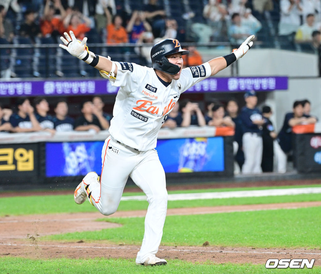 연장 10회말 1사 1, 3루 상황 한화 황영묵이 끝내기 안타를 날리고 환호하고 있다. 2025.09.03 / dreamer@osen.co.kr