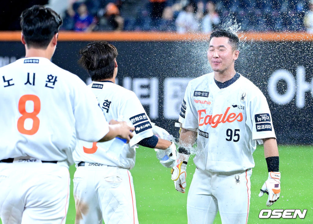 연장 10회말 1사 1, 3루 상황 한화 황영묵이 끝내기 안타를 날리고 동료들에게 물세례를 받고 있다. 2025.09.03 / dreamer@osen.co.kr
