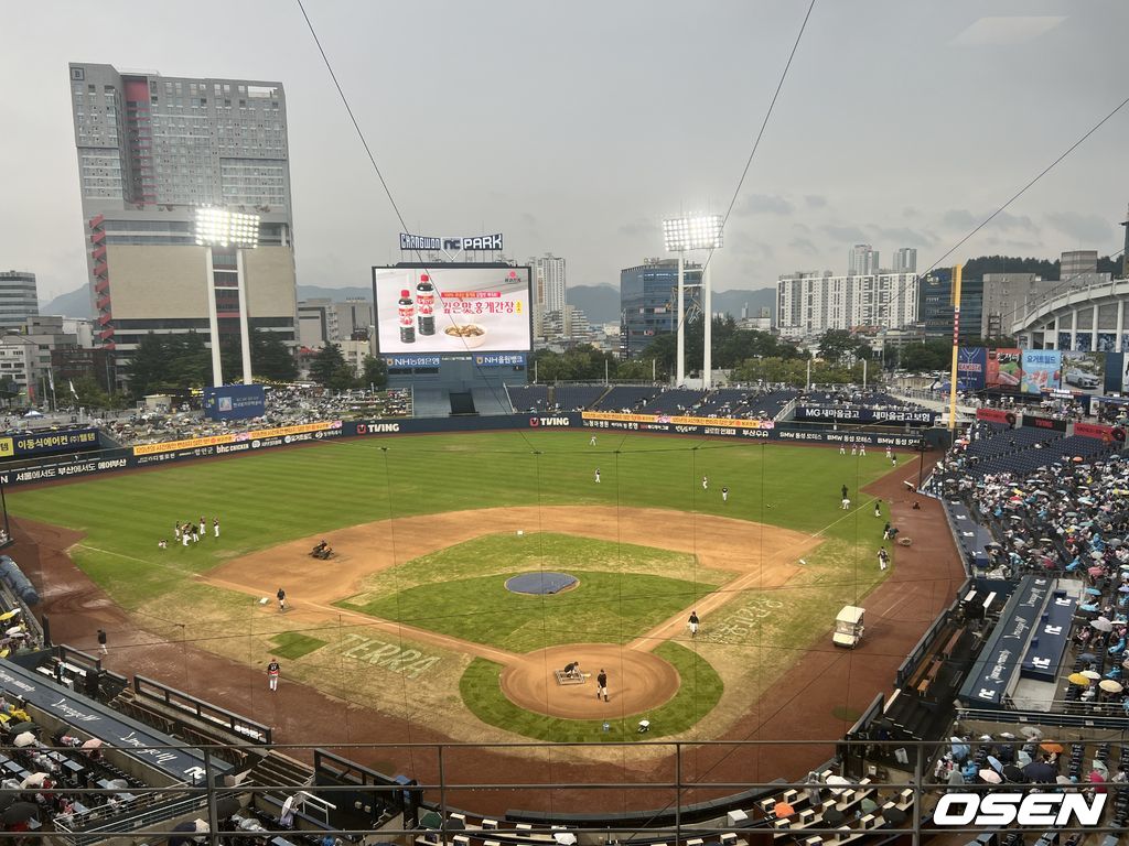이날 오후 3시 30분을 넘어선 시점부터 창원 NC파크에는 비구름이 가득했고 결국 한바탕 비가 쏟아졌다. 가늘었던 빗줄기도 갑자기 굵어졌다. 결국 한동안 비가 뿌렸지만 오후 4시 40분을 넘어선 시점부터 다시 비가 그쳤다.