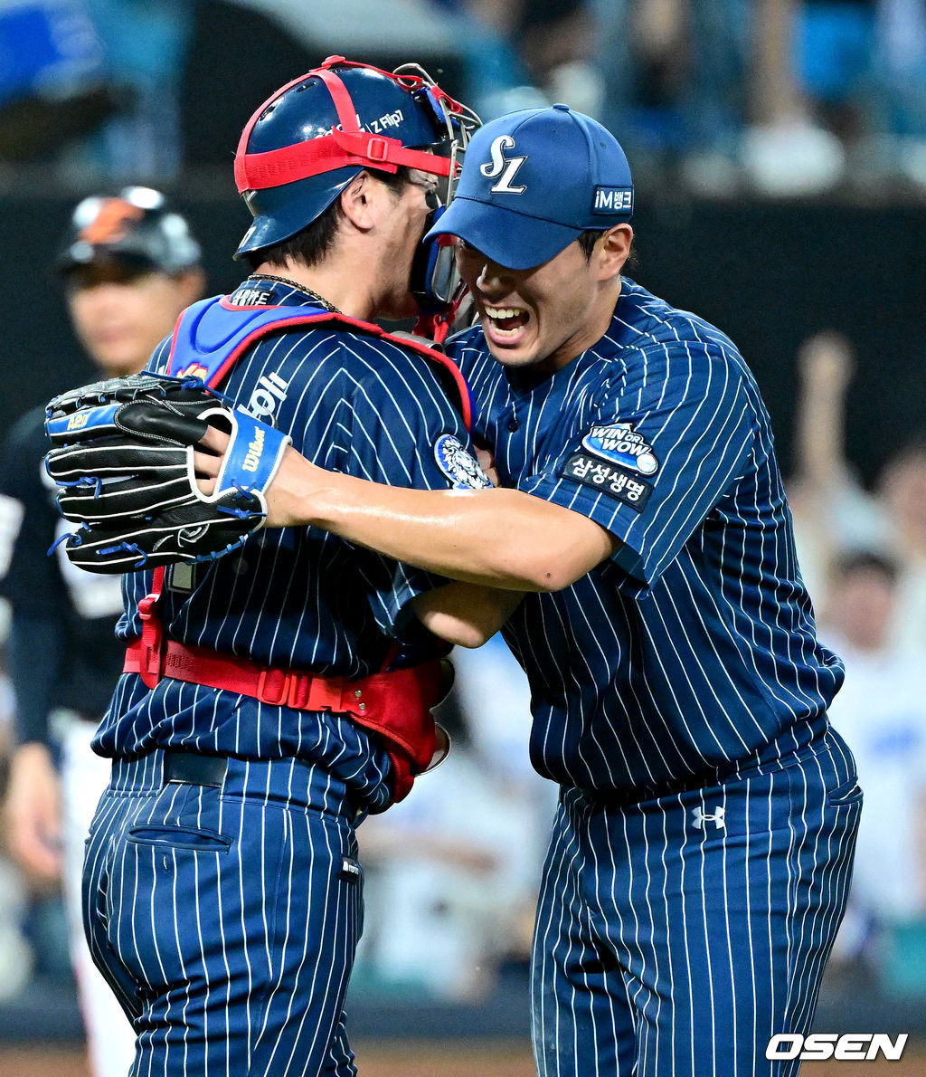 경기를 마무리지은 삼성 투수 김재윤과 포수 강민호가 기뻐하고 있다. 2025.09.06 / dreamer@osen.co.kr
