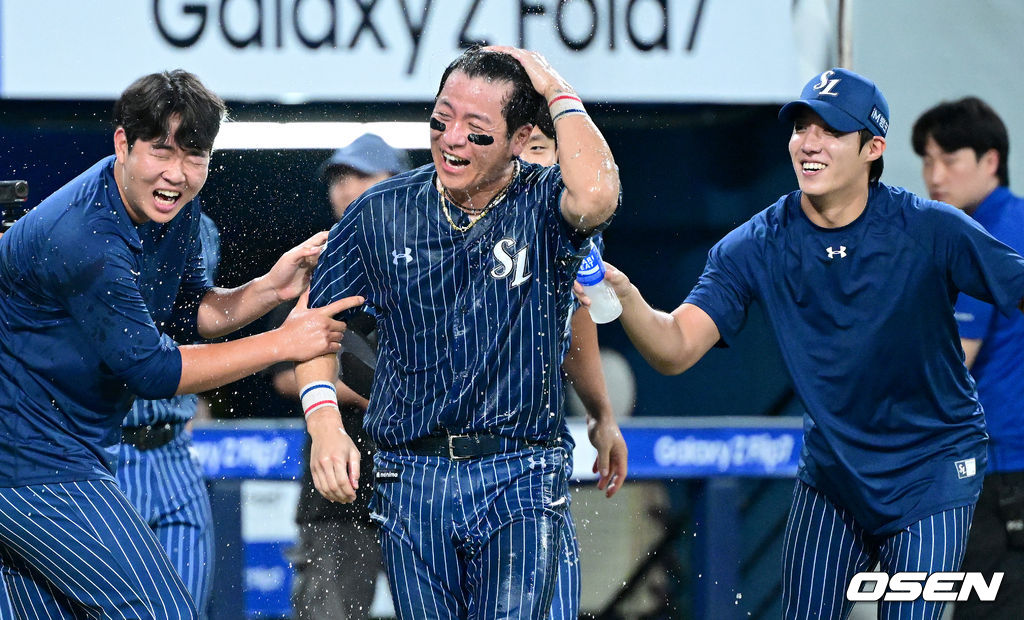 경기를 마치고 개인 통산 350홈런을 뽑아낸 삼성 강민호가 동료들의 물세례를 받고 있다. 2025.09.06 / dreamer@osen.co.kr