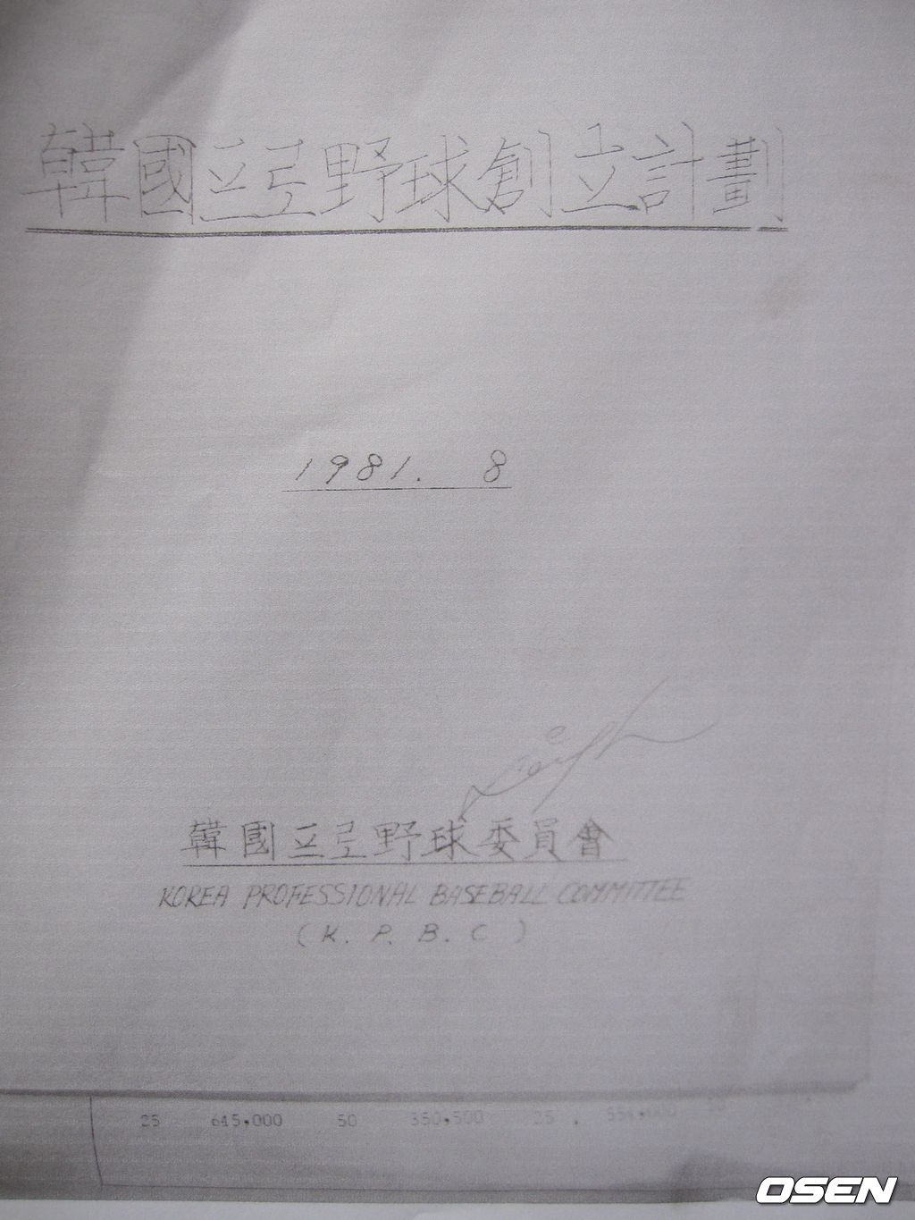 (아래)이용일 사무총장이 입안했던 ‘한국프로야구 창립 계획서’ 표지(최초 초고본)