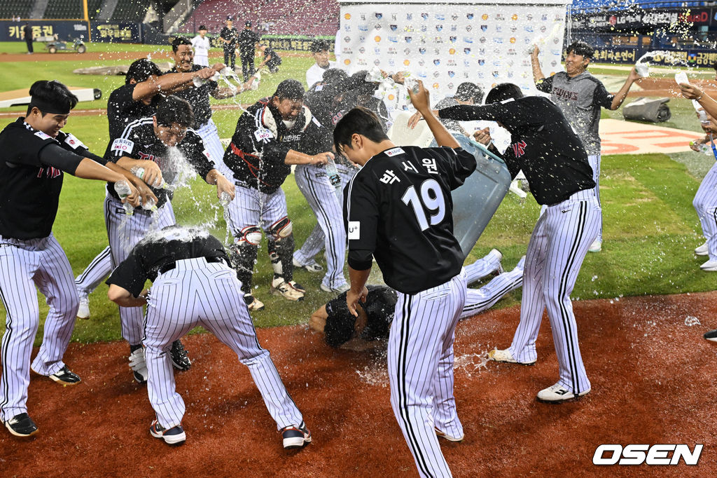 LG 손주영이 바닥에 엎드린 채 물세례를 맞고 있다. LG는 손주영이 10승을 달성하며 1994년 이후 31년 만에 선발 4명이 모두 두 자릿수 승수를 쌓는 기록을 만들었다.2025.09.10 /cej@osen.co.kr