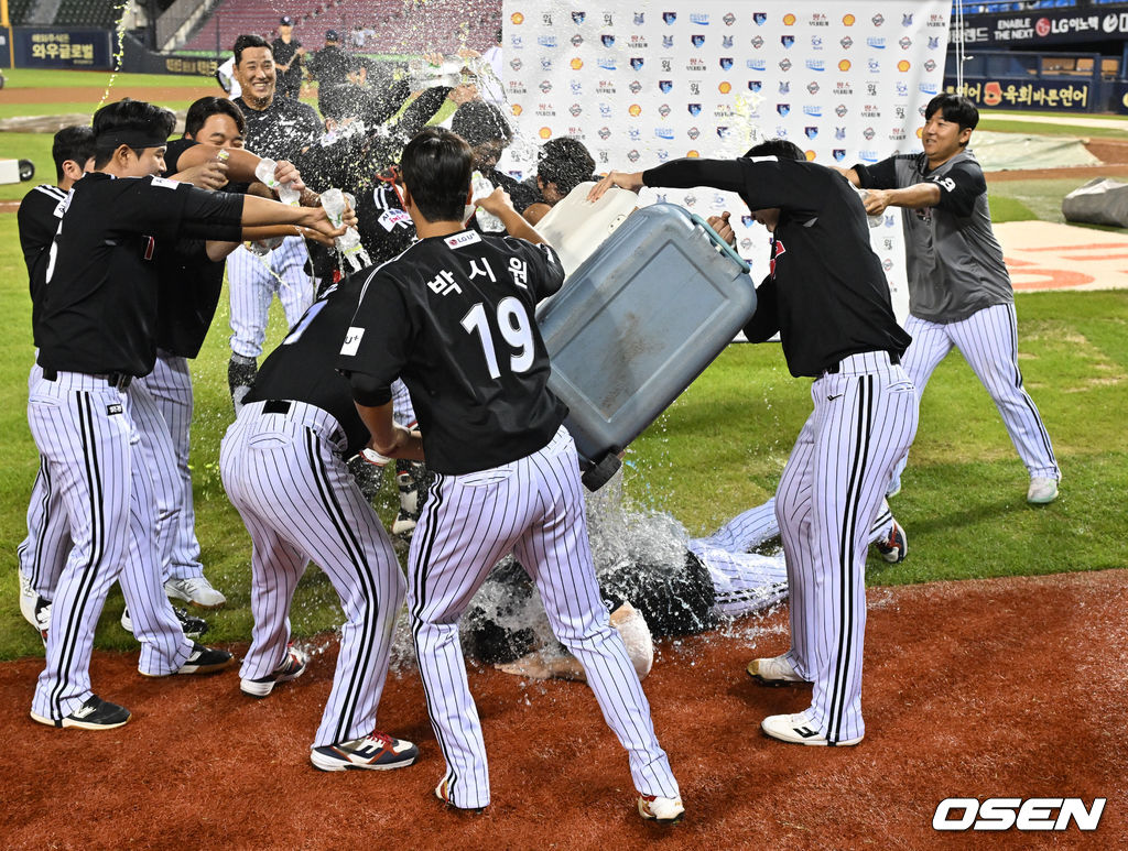 LG 손주영이 바닥에 엎드린 채 물세례를 맞고 있다. LG는 손주영이 10승을 달성하며 1994년 이후 31년 만에 선발 4명이 모두 두 자릿수 승수를 쌓는 기록을 만들었다.2025.09.10 /cej@osen.co.kr