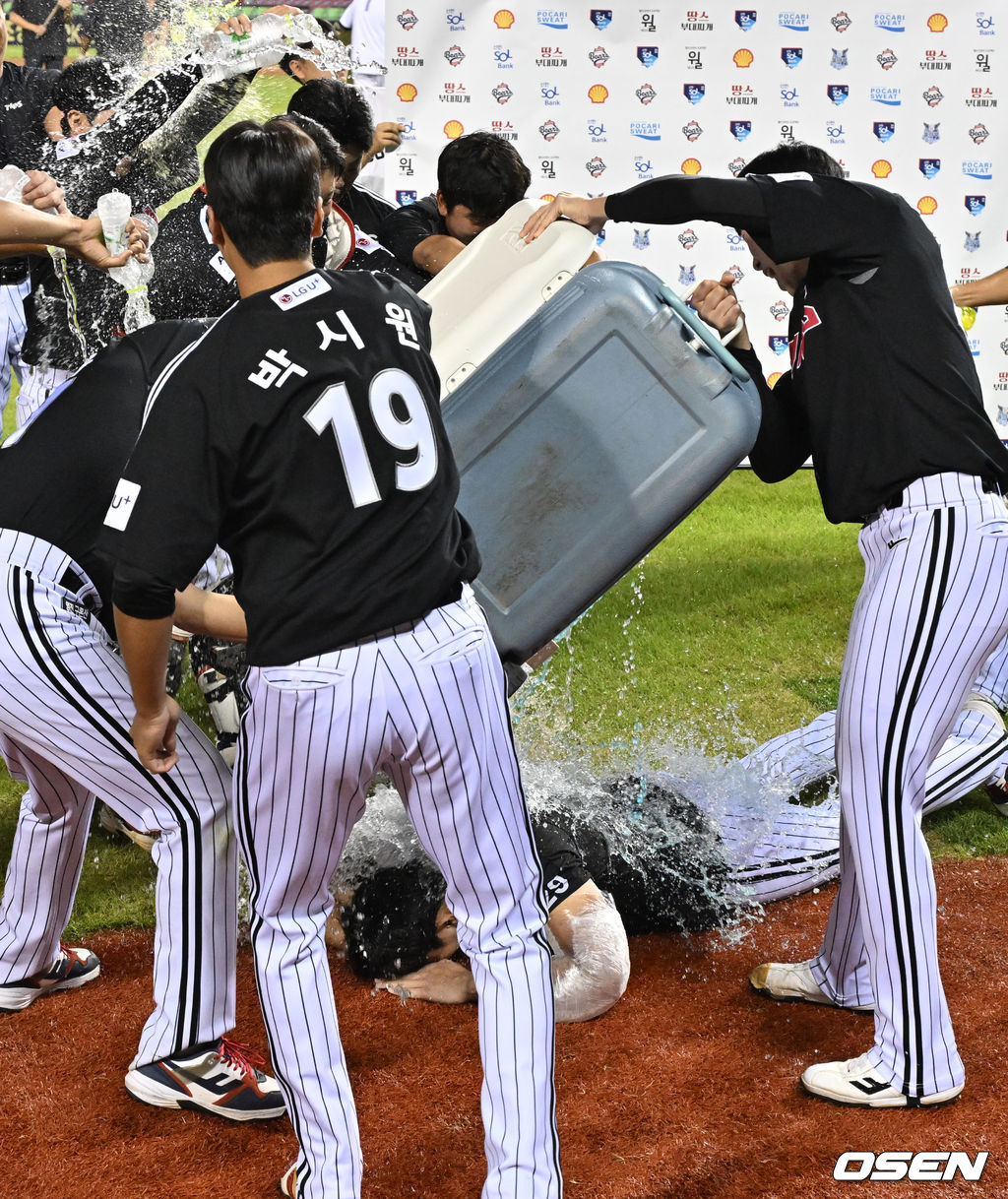 LG 손주영이 바닥에 엎드린 채 물세례를 맞고 있다. LG는 손주영이 10승을 달성하며 1994년 이후 31년 만에 선발 4명이 모두 두 자릿수 승수를 쌓는 기록을 만들었다. 2025.09.10 /cej@osen.co.kr