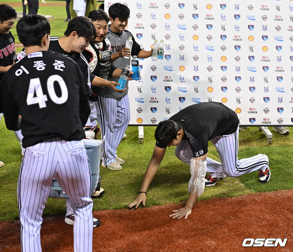 LG 손주영이 축하 물세례를 맞기 위해 엎드리고 있다. LG는 손주영이 10승을 달성하며 1994년 이후 31년 만에 선발 4명이 모두 두 자릿수 승수를 쌓는 기록을 만들었다. 2025.09.10 /cej@osen.co.kr