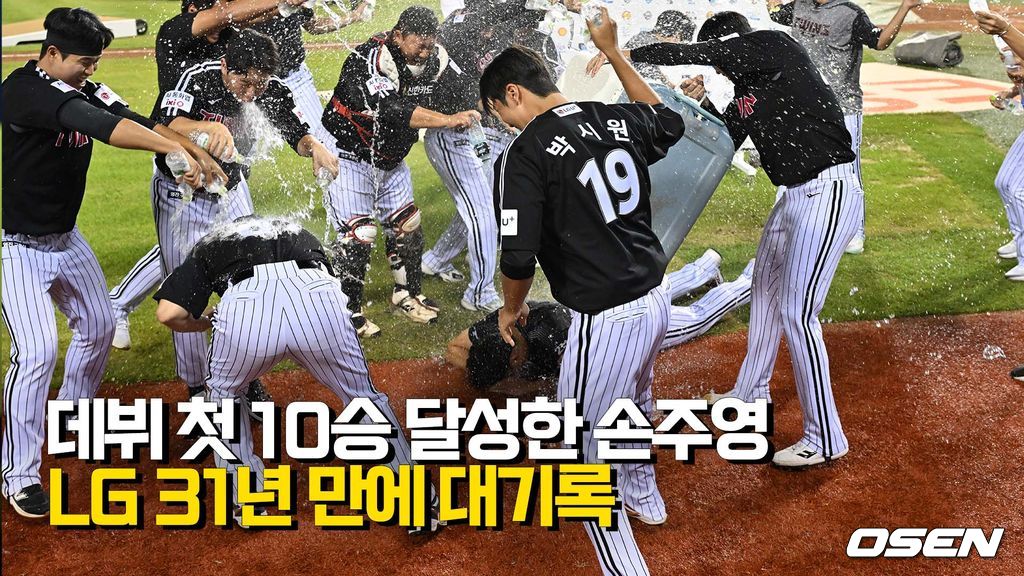 LG 손주영이 축하 물세례를 맞고 있다. LG는 손주영이 10승을 달성하며 1994년 이후 31년 만에 선발 4명이 모두 두 자릿수 승수를 쌓는 기록을 만들었다.2025.09.10 /cej@osen.co.kr