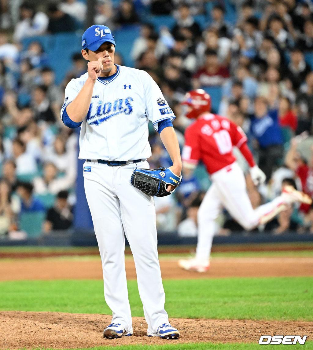 9회초 1사 1루에서 SSG 안상현에게 좌월 투런 홈런을 허용한 삼성 김재윤이 아쉬워하고 있다. 2025.09.11 /sunday@osen.co.kr