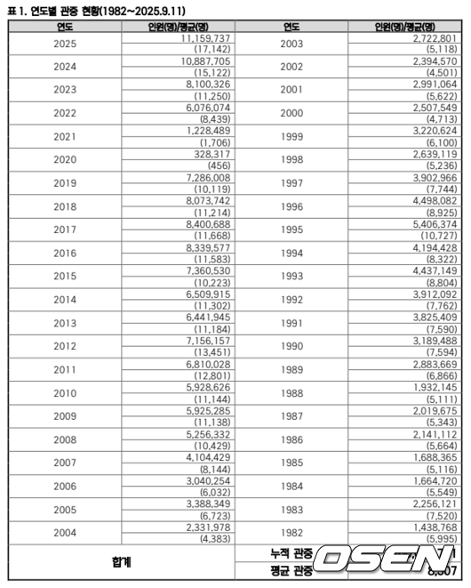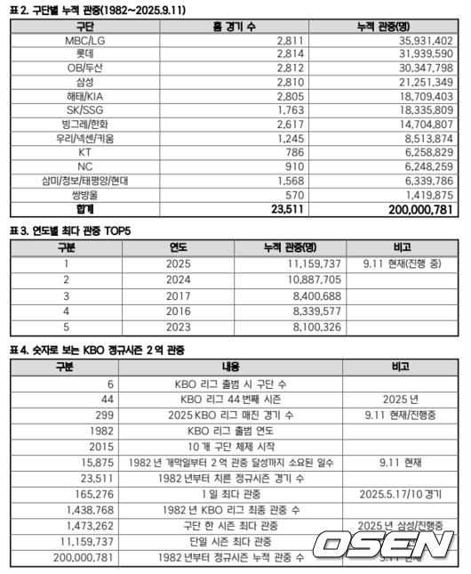 KBO 리그는 출범 첫 해인 1982년부터 지난 해까지 치러진 정규시즌 2만 2,860경기에서 누적 1억 8천 884만 1,044명으로 2억 관중 달성까지 1천115만 8,956명을 남겨두고 2025 시즌을 맞이했다. 어제 9월 11일(목)까지 1천115만9,737명의 관중이 입장하며 정규시즌 누적 2억 781명을 기록했다
