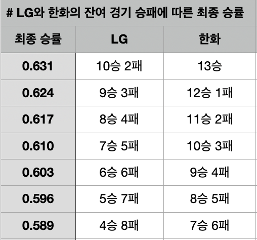 LG가 쫓기고 있지만, 여전히 LG가 유리하다. LG가 남은 12경기에서 7승 5패를 한다면, 한화는 10승 3패를 해야 동률이 된다. 9월 26~28일 맞대결 3연전에서 한화가 모두 승리해야 뒤집힐 것이다.