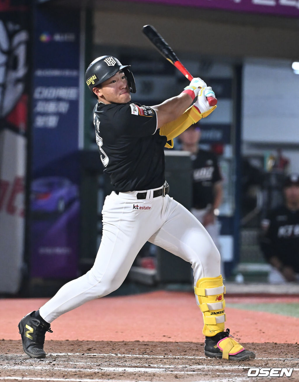 지난해 1군 무대에 첫선을 보인 안현민은 16경기에 나서 타율 2할(25타수 5안타) 1홈런 2타점 5득점을 남겼다. 이날 경기 전까지 350타수 114안타 타율 3할2푼6리 19홈런 70타점 64득점 7도루로 일찌감치 신인왕을 예약한 상태다. /what@osen.co.kr