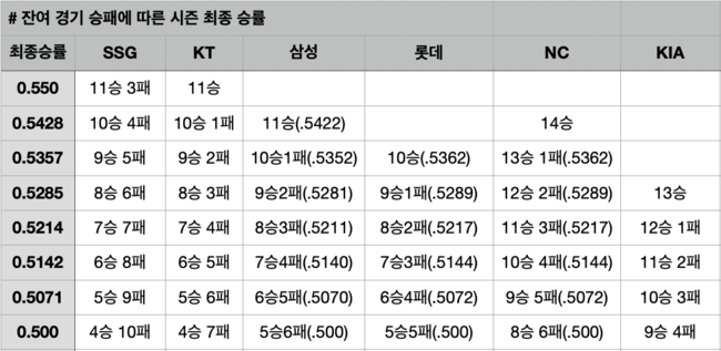 KIA가 남은 경기에서 11승 2패를 기록하더라도, 3위 SSG는 6승 8패, 4위 KT는 6승 5패, 5위 삼성은 7승 4패, 6위 롯데는 6승 4패, 7위 NC는 9승 5패를 해야 KIA가 5위 티켓을 차지할 수 있다. KIA는 남은 경기를 거의 다 이겨야 하는 상황이다.