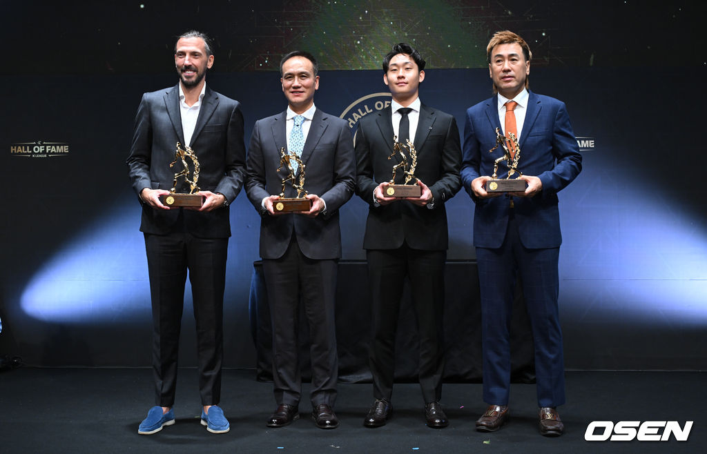 선수부문에 헌액된 데얀(왼쪽부터), 김주성, 고 유상철 아들 유선우 씨, 김병지가 포즈를 취하고 있다. 2025.09.16 /cej@osen.co.kr
