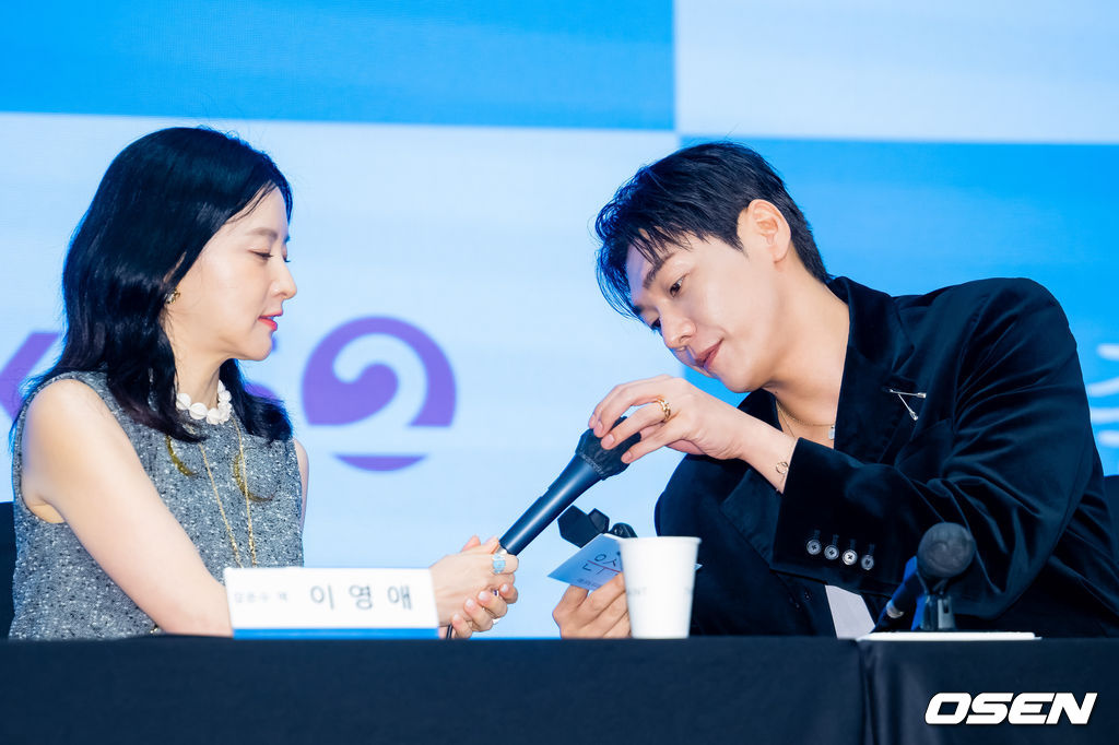 기자간담회에서 배우 김영광이 이영애의 마이크에 부착물을 부착해주고 있다. 2025.09.16 / rumi@osen.co.kr