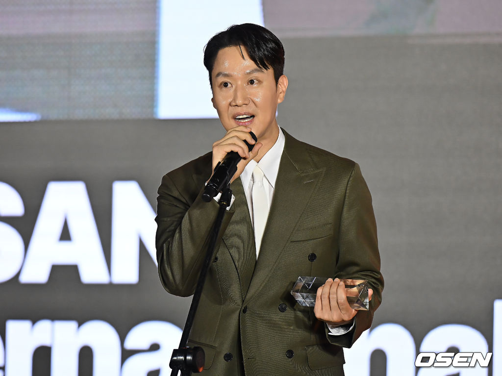 부산이 사랑하는 영화인으로 선정된 배우 정우가 최진봉 부산 중구청장으로부터 감사패를 받고 소감을 발표하고 있다. 2025.09.16 / foto0307@osen.co.kr