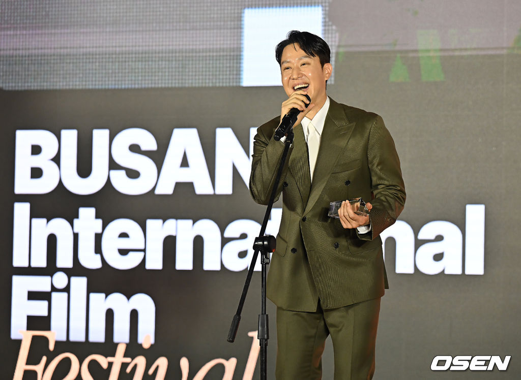 부산이 사랑하는 영화인으로 선정된 배우 정우가 최진봉 부산 중구청장으로부터 감사패를 받고 소감을 발표하고 있다. 2025.09.16 / foto0307@osen.co.kr