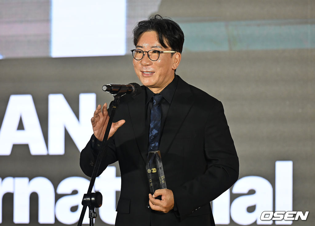 부산이 사랑하는 영화인으로 선정된 윤제균 감독이 최진봉 부산 중구청장으로부터 감사패를 받고 소감을 발표하고 있다. 2025.09.16 / foto0307@osen.co.kr