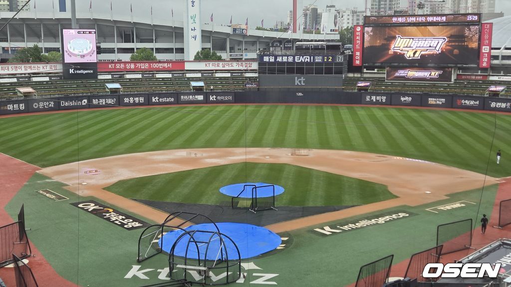 그런데 오후에 기습 폭우가 내리면서 KT위즈파크 내야에는 물웅덩이가 여러개 생겼다. 대형 방수포가 아닌 마운드와 홈플레이트만 방수포를 덮어뒀기 때문이다.