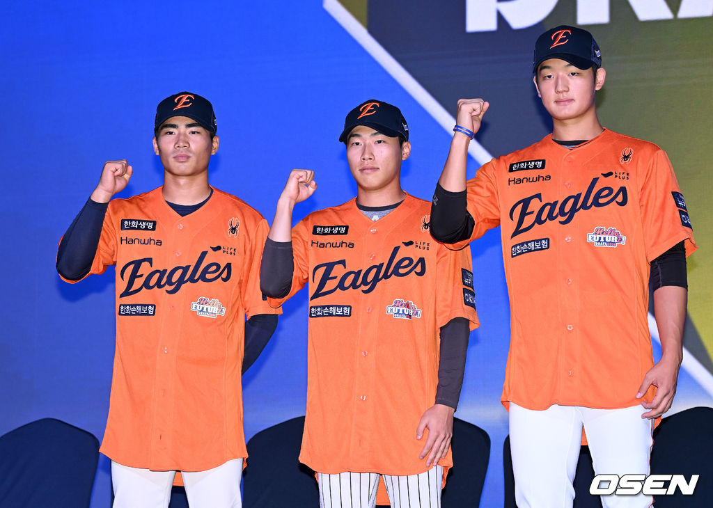 한화에 지명된 신인 오재원, 최유빈, 강건우가 기념촬영을 가지고 있다. 2025.09.17 /sunday@osen.co.kr