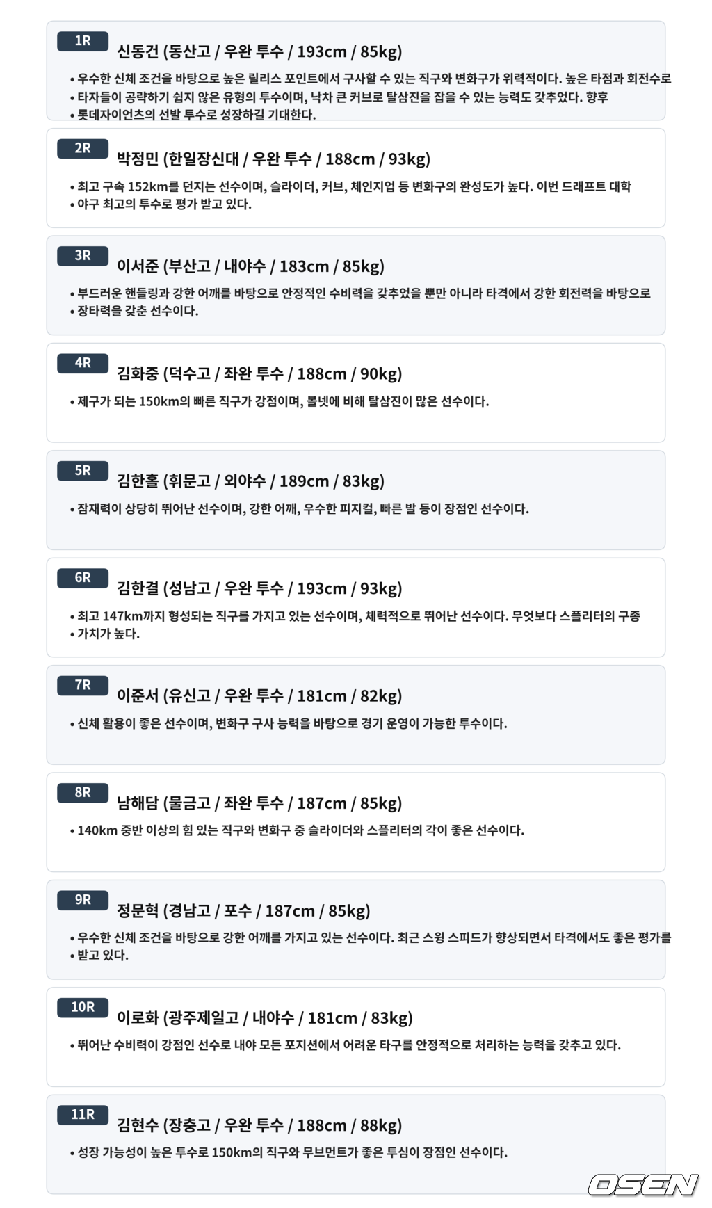 롯데 박준혁 단장은 “2026 KBO 신인 지명을 위해 현장과 더불어 스카우트팀, 운영팀, 육성팀과 많은 대화를 나누었다. 투수 파트에서는 즉시 전력감 투수, 미래의 선발 자원 육성, 불펜의 다양성 등을 고려했다. 야수 파트에서는 장타력, 안정적인 수비 능력 등을 고려했다”고 총평했다.