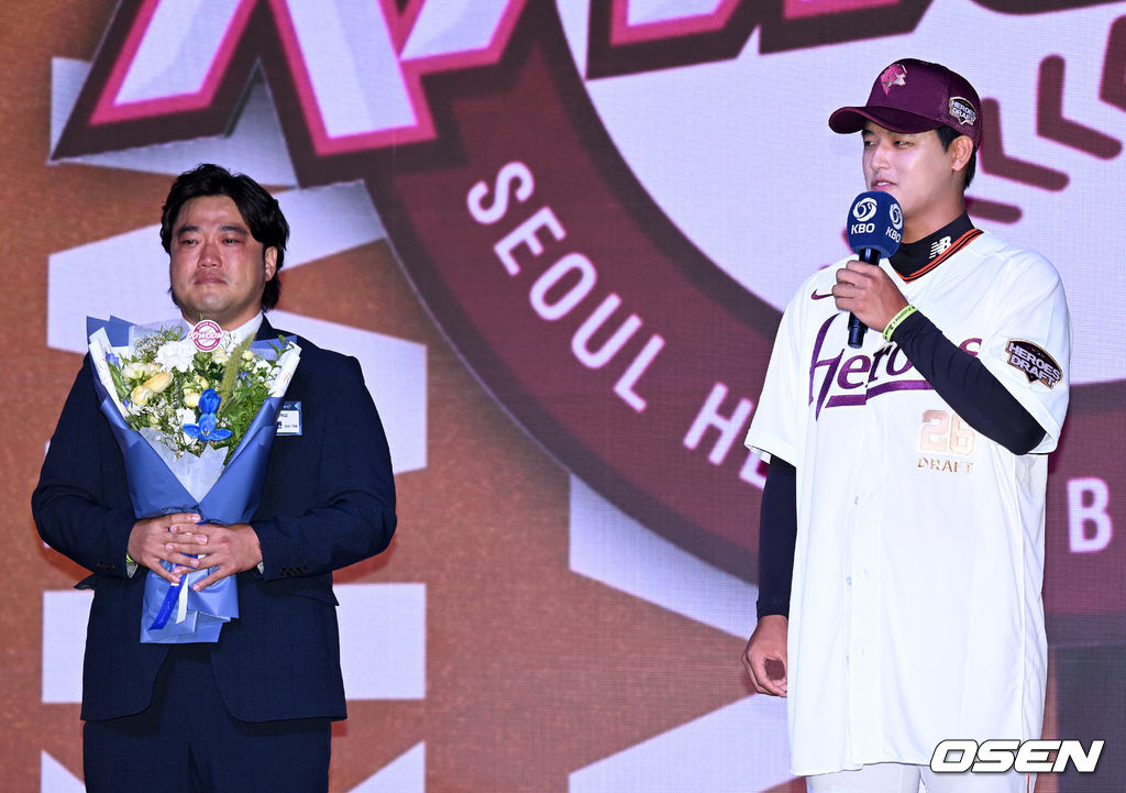 무대에 오른 박준현은 허승필 단장의 도움으로 키움의 버건디 유니폼을 입고 차분히 소감을 밝혔다. “야구를 시작하면서부터 전체 1순위가 목표였는데 그 꿈을 이뤄 주신 키움 관계자분들께 감사드린다. 항상 뒷바라지해 주신 부모님, 북일고 이상군 감독님, 그리고 야구를 가르쳐주신 여러 은사님들께도 감사드린다. 함께 고생한 친구들이 모두 프로에 지명되길 바라며, 그렇지 않더라도 언젠가 다시 함께 뛰었으면 좋겠다.”