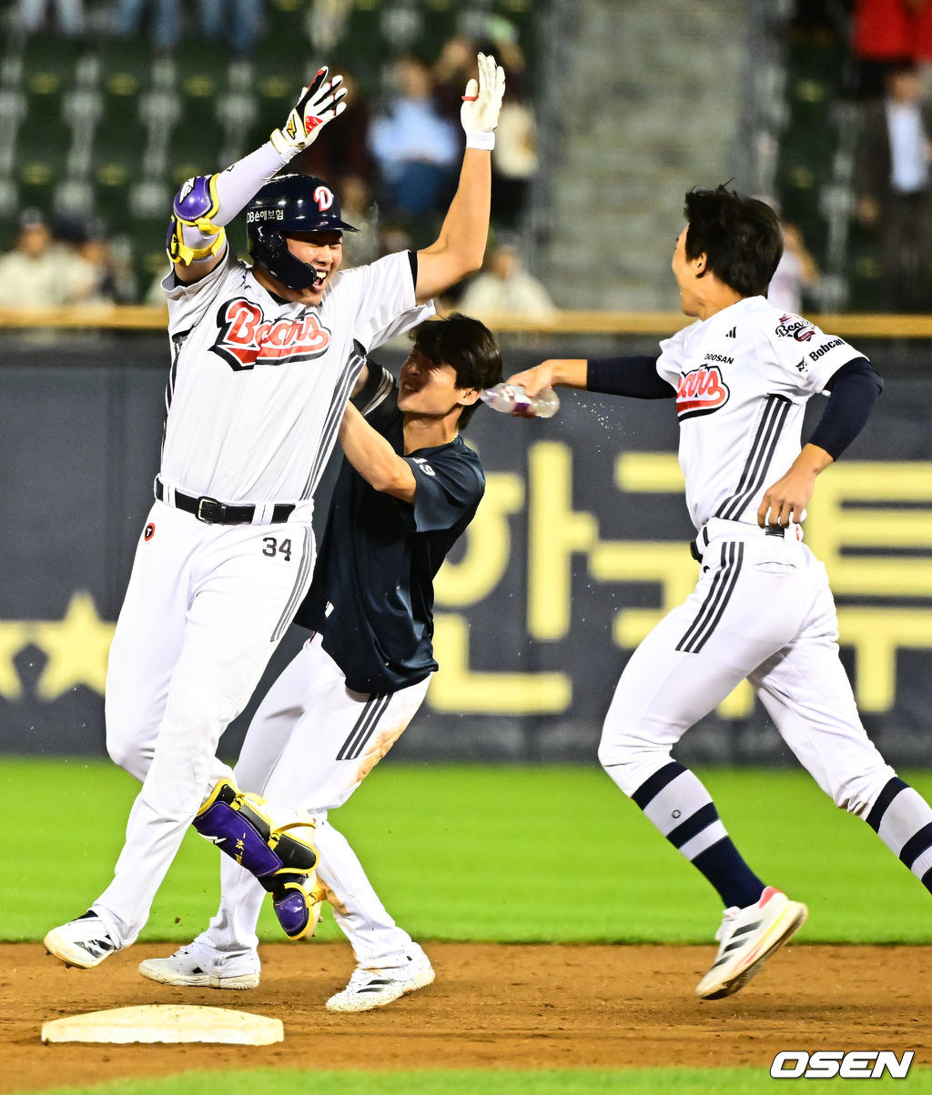 경기를 마치고 끝내기 안타를 날린 두산 홍성호가 동료선수들과 승리를 기뻐하고 있다. 2025.09.18 /jpnews@osen.co.kr