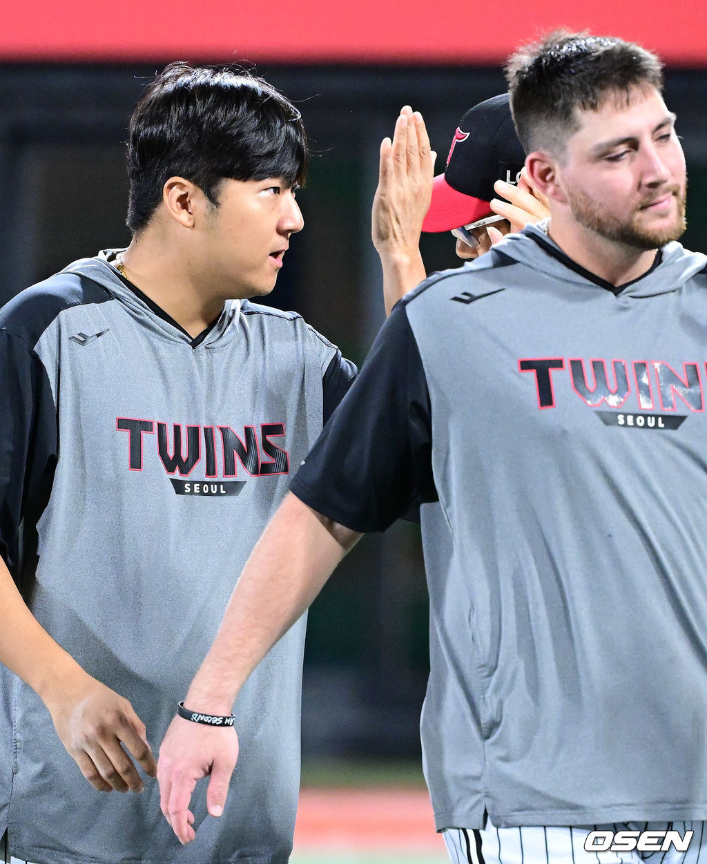 경기를 마치고 승리 투수 LG 송승기와 염경엽 감독이 인사를 나누고 있다. 2025.09.18 / dreamer@osen.co.kr