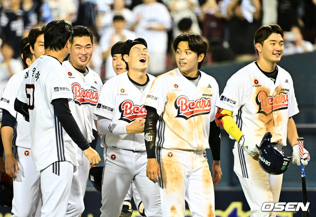 경기를 마치고 끝내기 안타를 날린 두산 홍성호가 동료선수들과 승리를 기뻐하고 있다. 2025.09.18 /jpnews@osen.co.kr