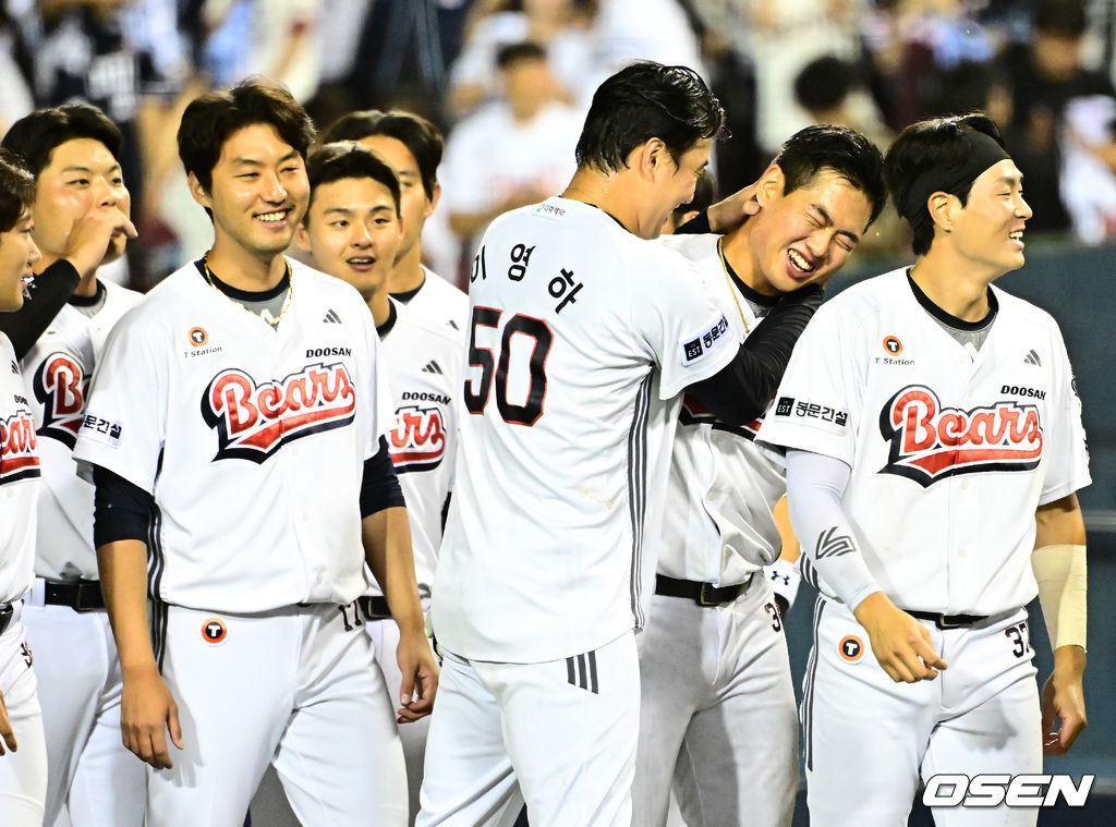 경기를 마치고 끝내기 안타를 날린 두산 홍성호가 동료선수들과 승리를 기뻐하고 있다. 2025.09.18 /jpnews@osen.co.kr