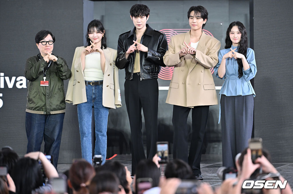 김륜희 제작자, 김유정, 김영대, 김도훈, 김이경이 야외무대인사를 마치고 포토 타임을 갖고 있다. 2025.09.19 / foto0307@osen.co.kr