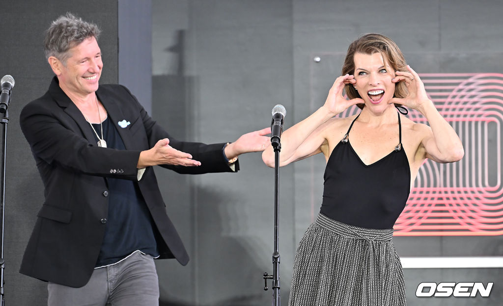 밀라 요보비치와 남편 폴 앤드슨 프로듀서가 야외무대인사를 하고 있다. 2025.09.19 / foto0307@osen.co.kr