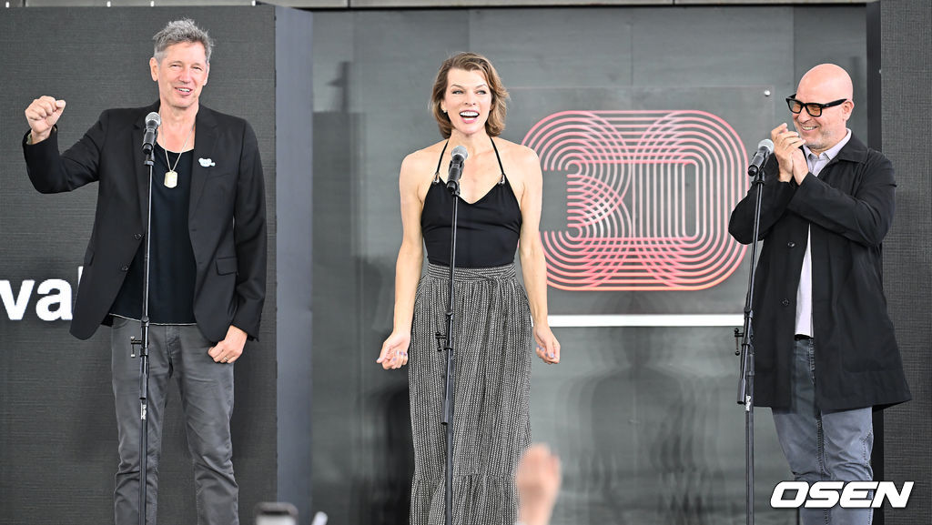 폴 앤드슨 프로듀서, 밀라 요보비치, 애드리언 그런버그 감독이 야외무대인사를 하고 있다. 2025.09.19 / foto0307@osen.co.kr