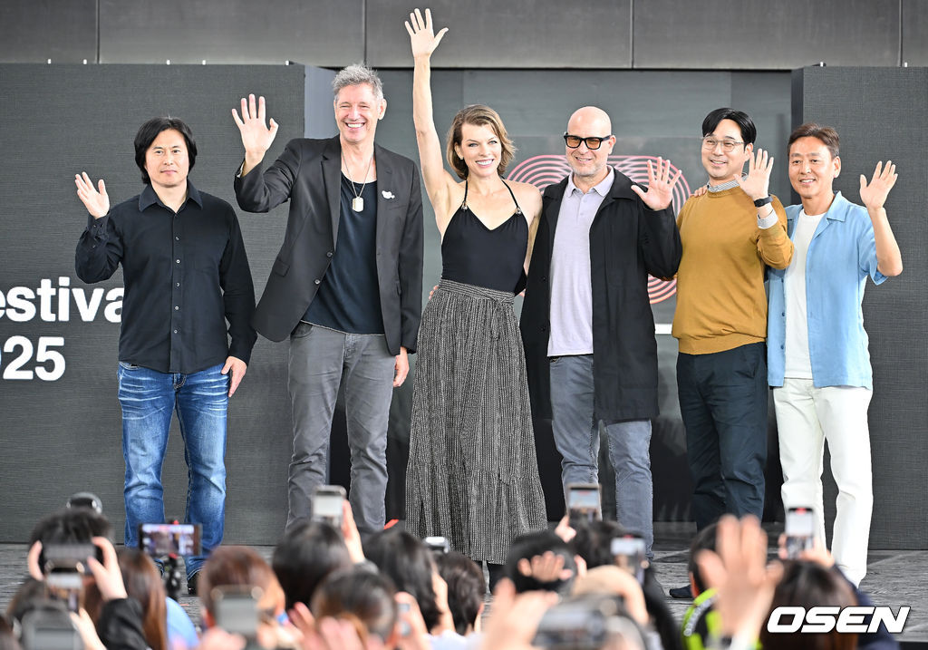 박호성 프로듀서, 폴 앤드슨 프로듀서, 밀라 요보비치, 애드리언 그런버그 감독, 문봉섭 작가, 주방옥 프로듀서가 야외무대인사를 포토타임을 갖고 있다. 2025.09.19 / foto0307@osen.co.kr