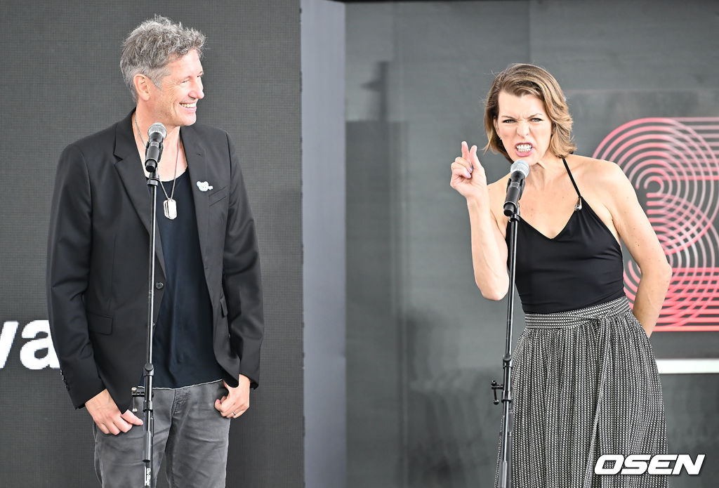 밀라 요보비치와 남편 폴 앤드슨 프로듀서가 야외무대인사를 하고 있다. 2025.09.19 / foto0307@osen.co.kr