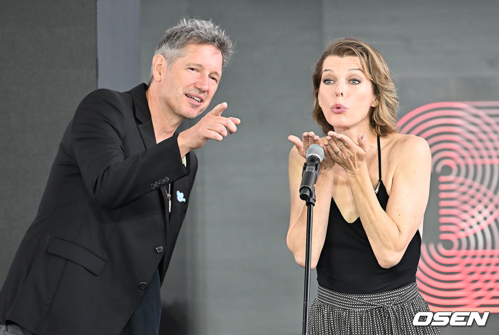 밀라 요보비치와 남편 폴 앤드슨 프로듀서가 야외무대인사를 하고 있다. 2025.09.19 / foto0307@osen.co.kr