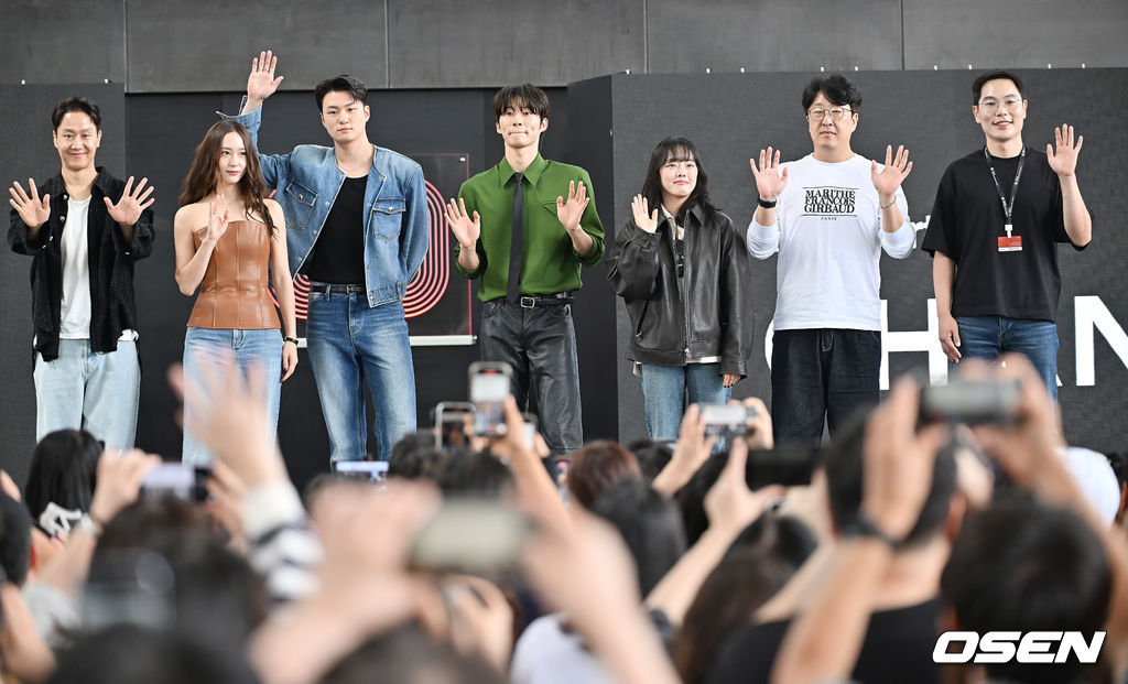 정우 감독 겸 배우, 오성호 감독, 정수정, 신승호, 조범규, 권소현, 현봉식이 오픈토크를 마치고 포토 타임을 갖고 있다. 2025.09.20 / foto0307@osen.co.kr