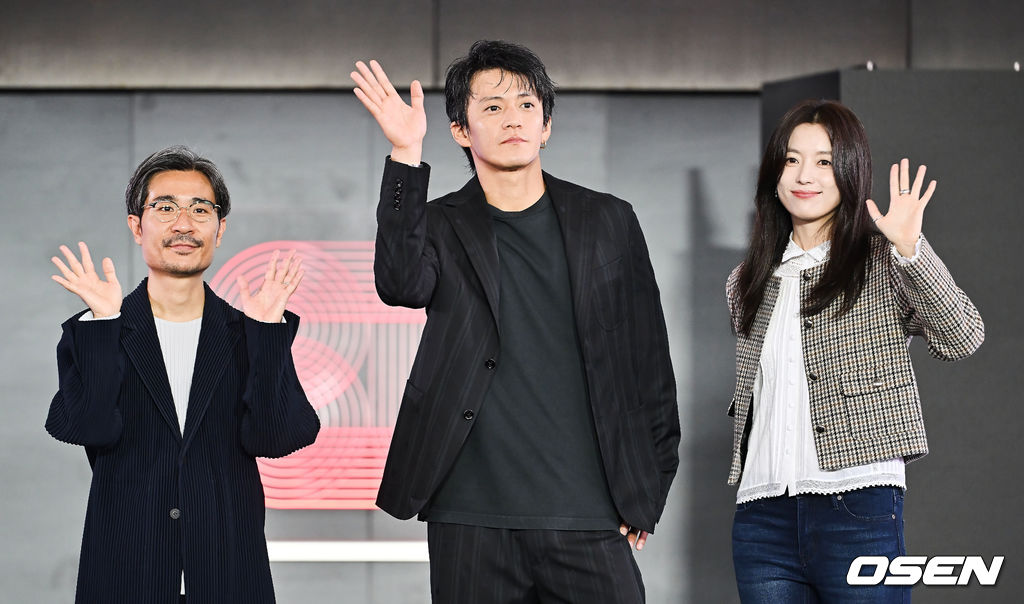 츠키카와 쇼 감독, 오구리 슌, 한효주가 야외무대인사를 마치고 포토 타임을 하고 있다. 2025.09.20 / foto0307@osen.co.kr