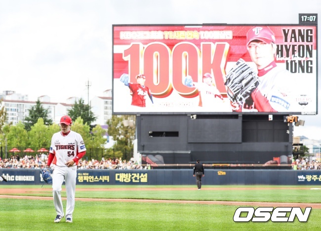 양현종은 20일 광주-KIA 챔피언스필드에서 열린 2025 프로야구 NC 다이노스와의 홈 경기에 선발로 등판했다. 1회초 2사 1루에서 이우성을 헛스윙 삼진으로 잡아 냈다. 시즌 100번째 탈삼진이었다.