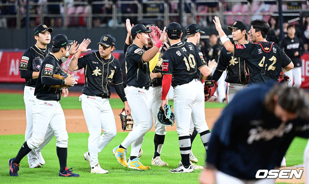 경기를 마치고 승리한 KT 선수들이 하이파이브를 나누고 있다. 2025.09.20 / dreamer@osen.co.kr