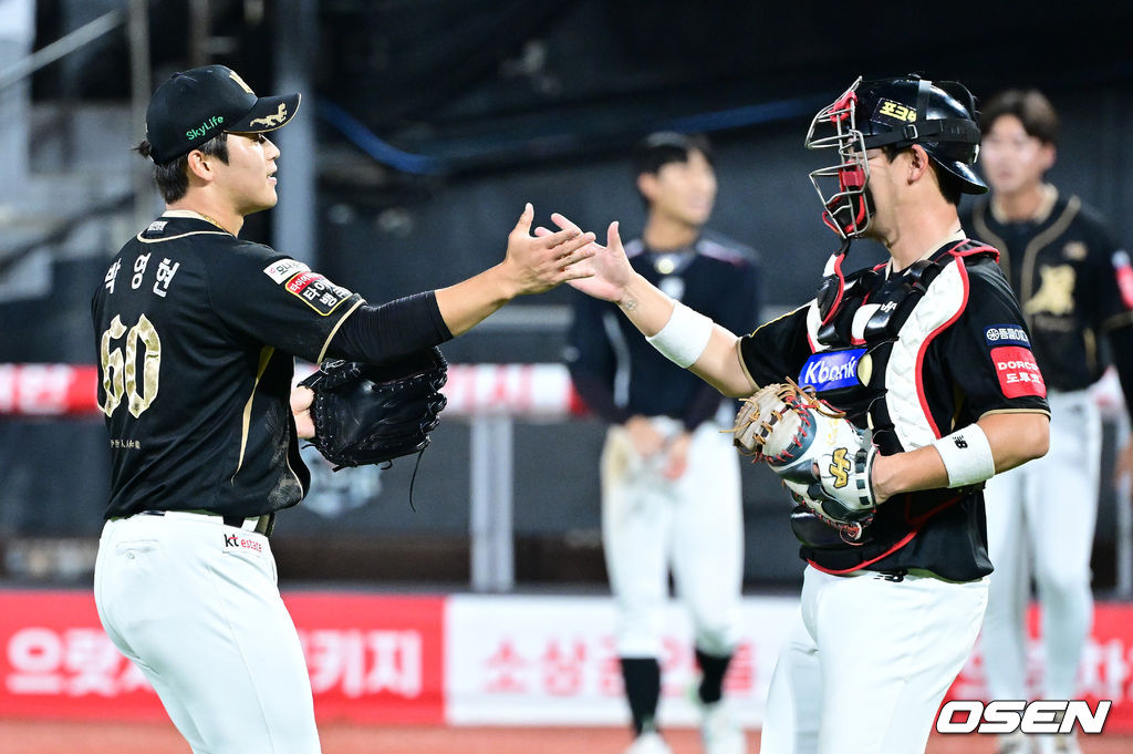 경기를 마무리지은 KT 투수 박영현과 포수 조대현이 인사를 나누고 있다. 2025.09.20 / dreamer@osen.co.kr