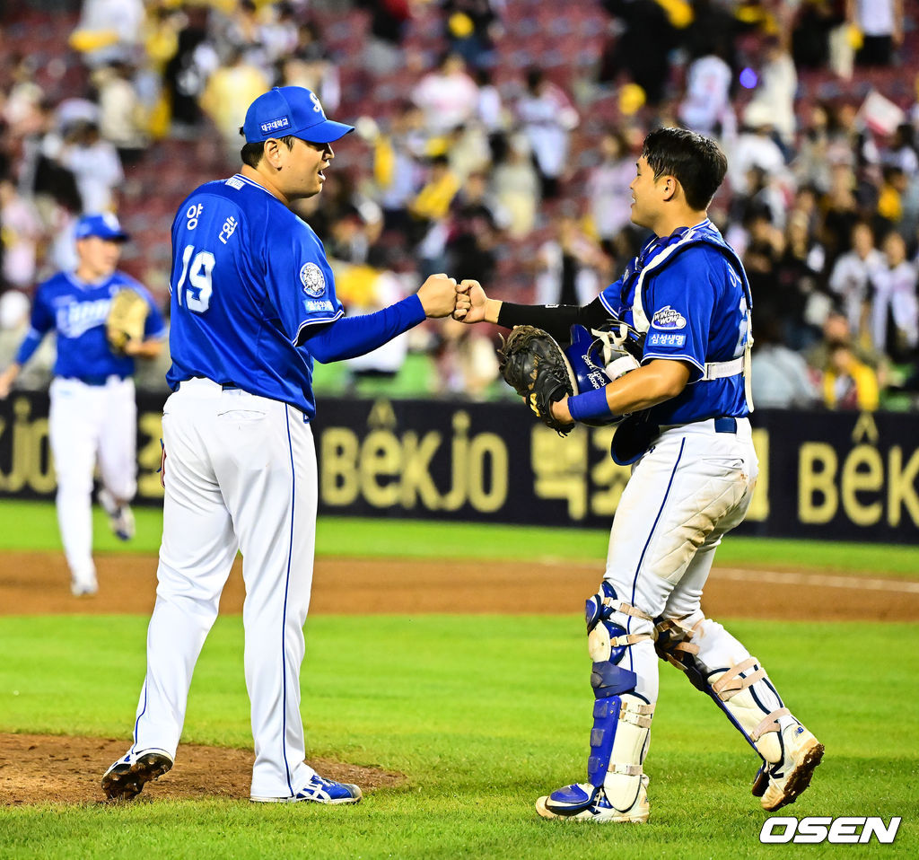 경기를 마치고 삼성 양현, 이병헌이 승리를 기뻐하고 있다. 2025.09.20 /jpnews@osen.co.kr