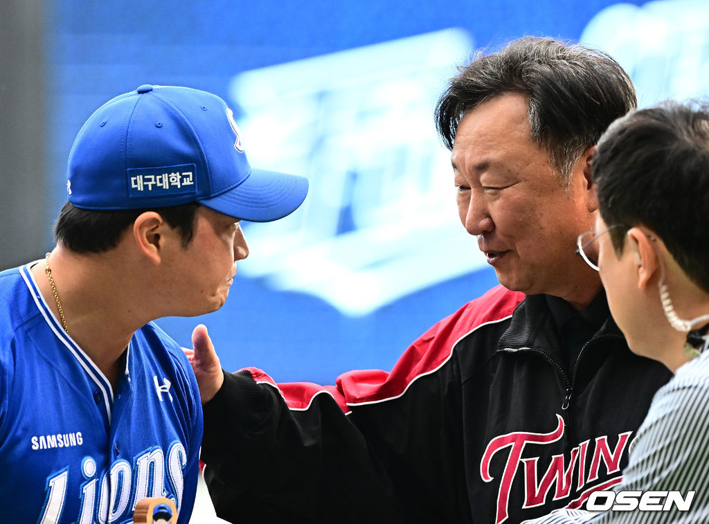 경기에 앞서 삼성 오승환 은퇴투어가 열렸다. 오승환이 LG 차명석 단장과 인사를 나누고 있다. 2025.09.20 /jpnews@osen.co.kr