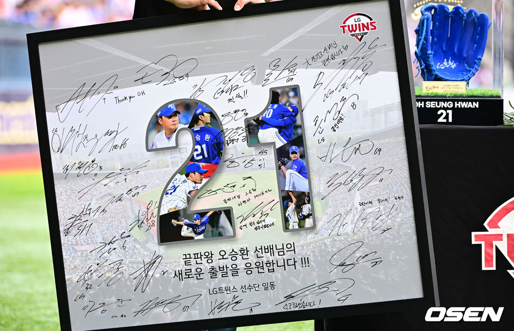 경기에 앞서 삼성 오승환 은퇴투어가 열렸다. LG 선수단이 준비한 선물. 2025.09.20 /jpnews@osen.co.kr