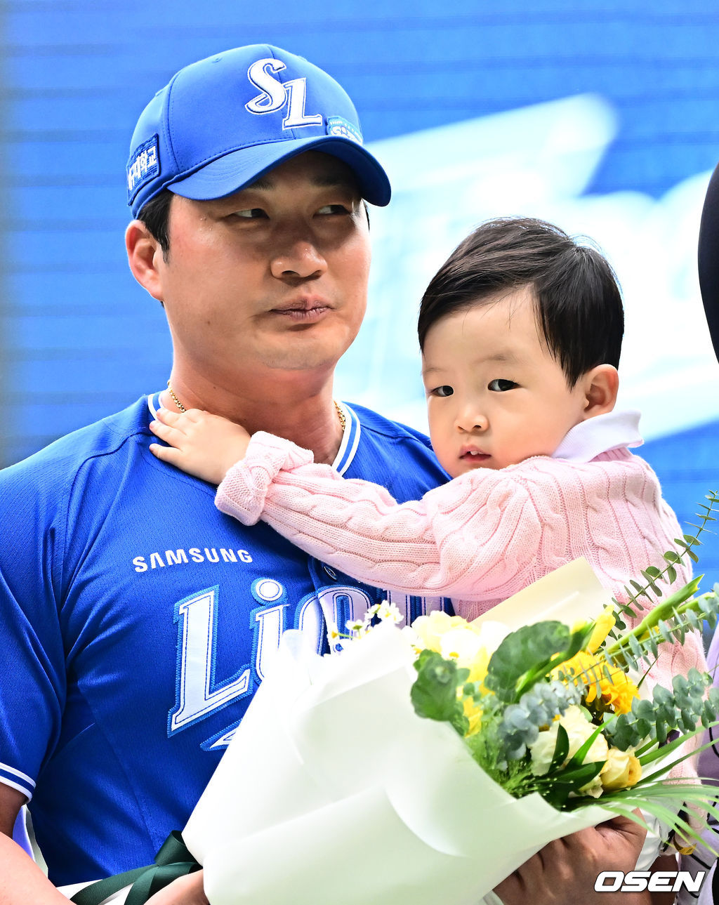 경기에 앞서 삼성 오승환 은퇴투어가 열렸다. 오승환이 아들을 안고 미소를 짓고 있다. 2025.09.20 /jpnews@osen.co.kr