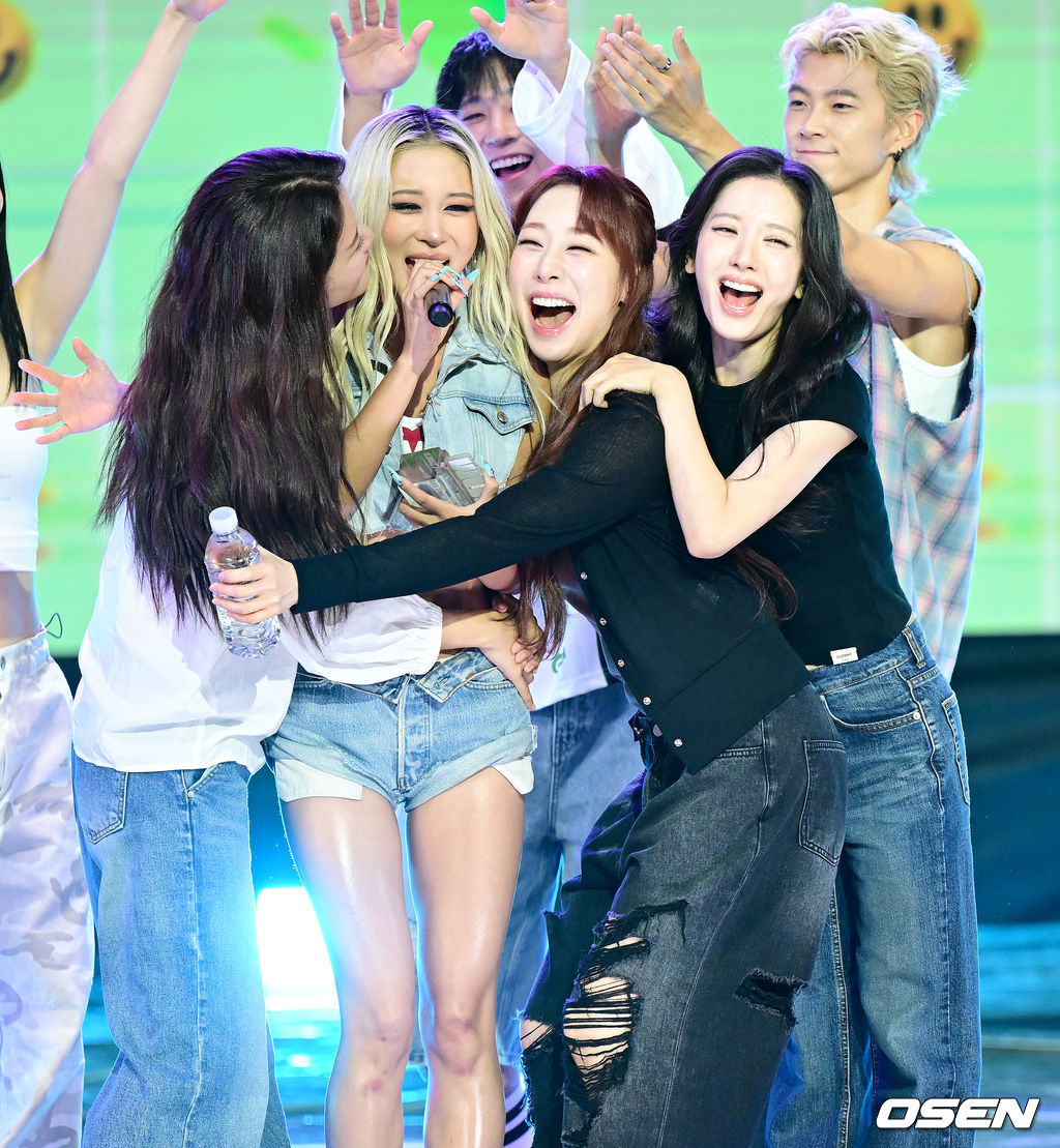 우주소녀 다영이 더쇼 초이스를 차지한 뒤 앙코를 무대를 펼치며 멤버 엑시, 연정, 보나의 축하를 받고 있다. 2025.09.23 / dreamer@osen.co.kr