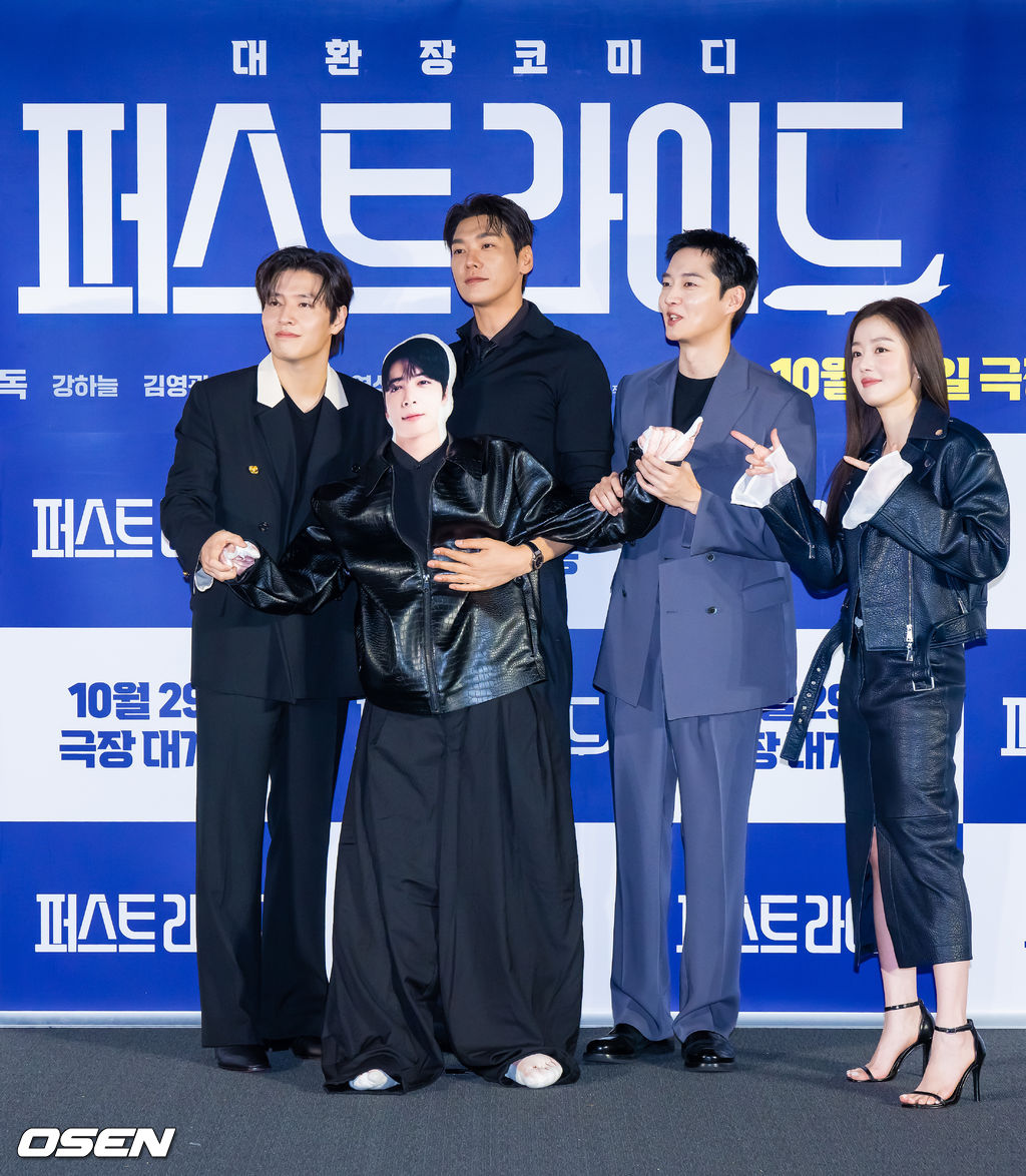 배우 강하늘과 김영광, 강영석, 한선화가 차은우 인형과 함께 포즈를 취하고 있다. 2025.09.25 / soul1014@osen.co.kr