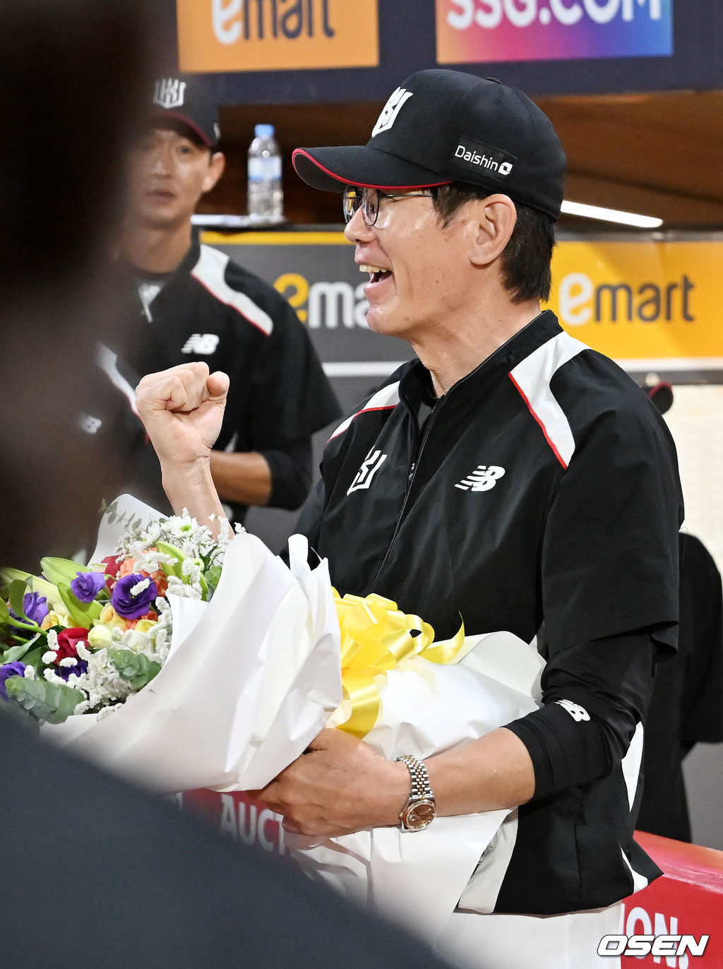 경기를 마치고 1000경기를 치른 KT 이강철 감독이 선수들에게 꽃다발을 받고 기뻐하고 있다.. 2025.09.25 / rumi@osen.co.kr