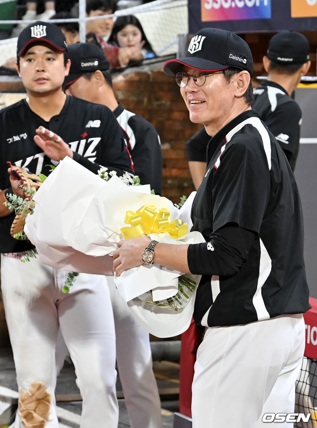 경기를 마치고 1000경기를 치른 KT 이강철 감독이 선수들에게 꽃다발을 받고 있다. 2025.09.25 / rumi@osen.co.kr