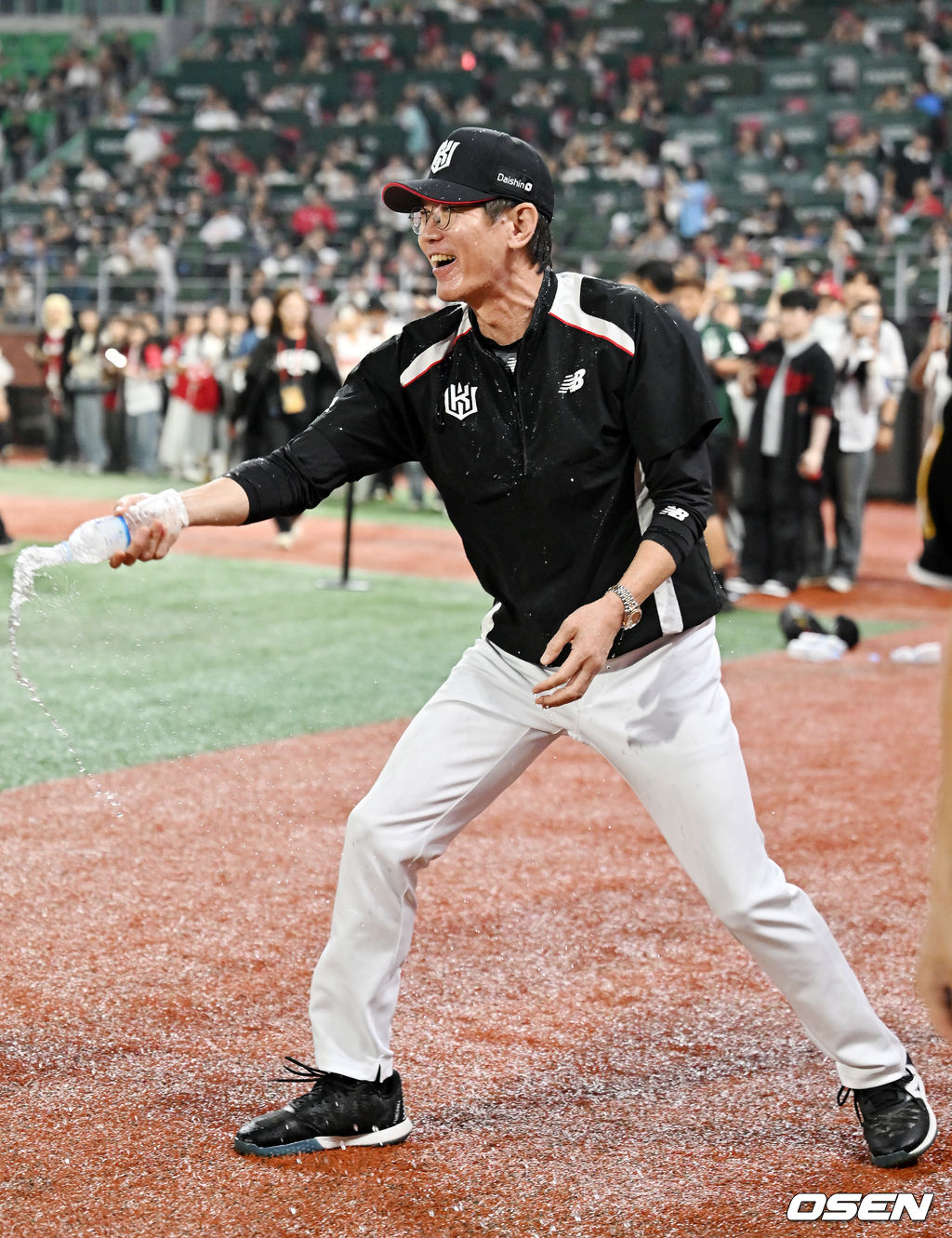 경기를 마치고 통산 1000경기를 치른 KT 이강철 감독이 선수들에게 축하 물세례를 받은 후 물을 뿌리고 있다. 2025.09.25 / rumi@osen.co.kr