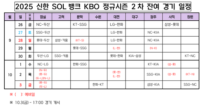 KBO는 26일 2025 신한 SOL뱅크 KBO리그 정규시즌 2차 잔여 경기 일정을 확정했다.